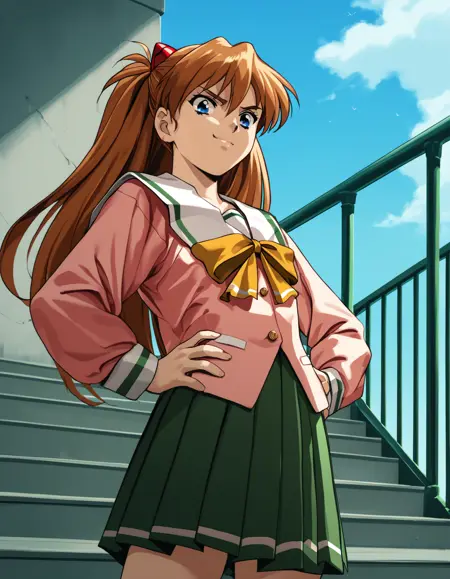 - asami, short hair, red hair, blue eyes, serafuku, pink shirt, pleated skirt