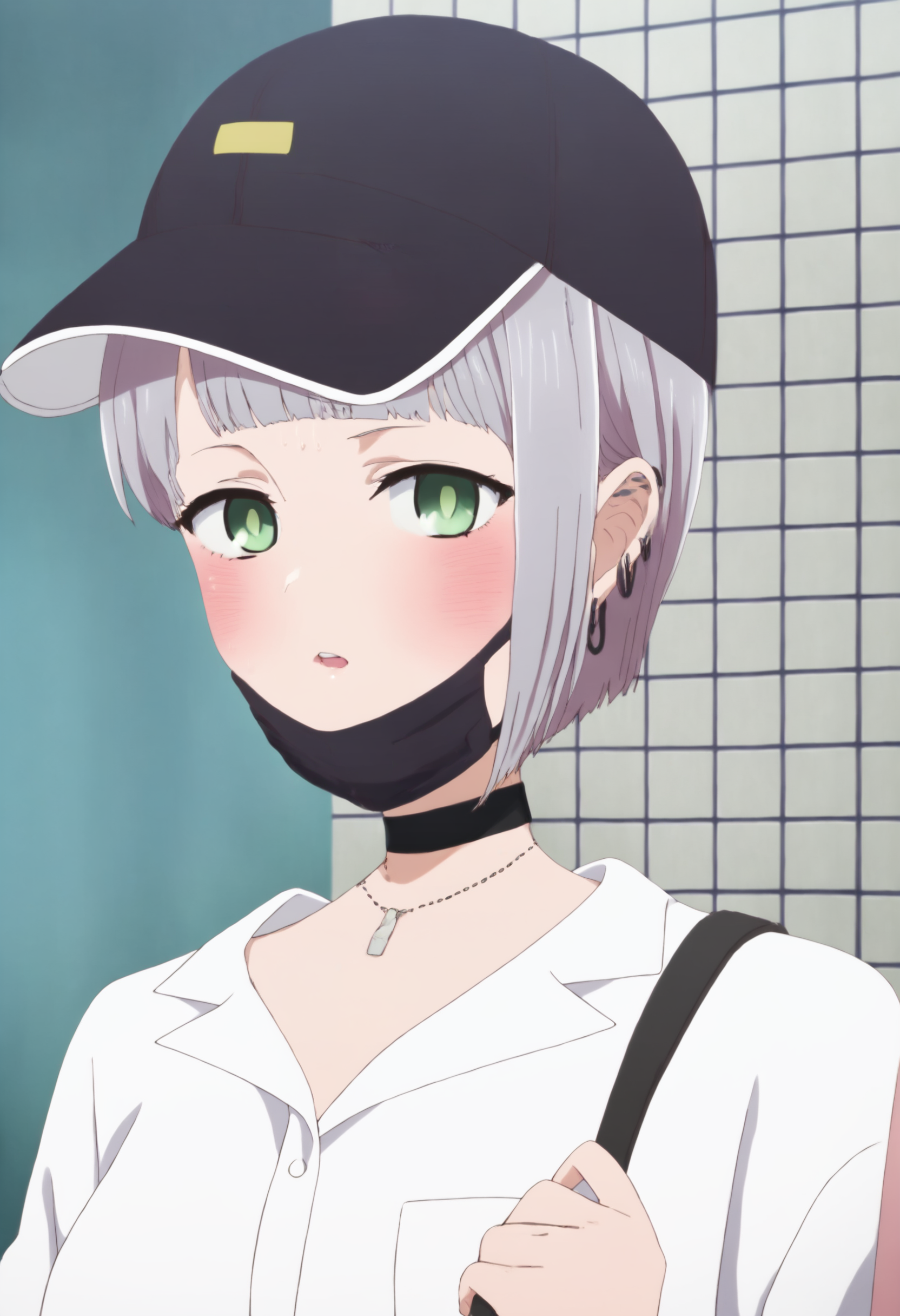 white shirt, choker, hat, ear piercing, black pants | mouth mask, bag