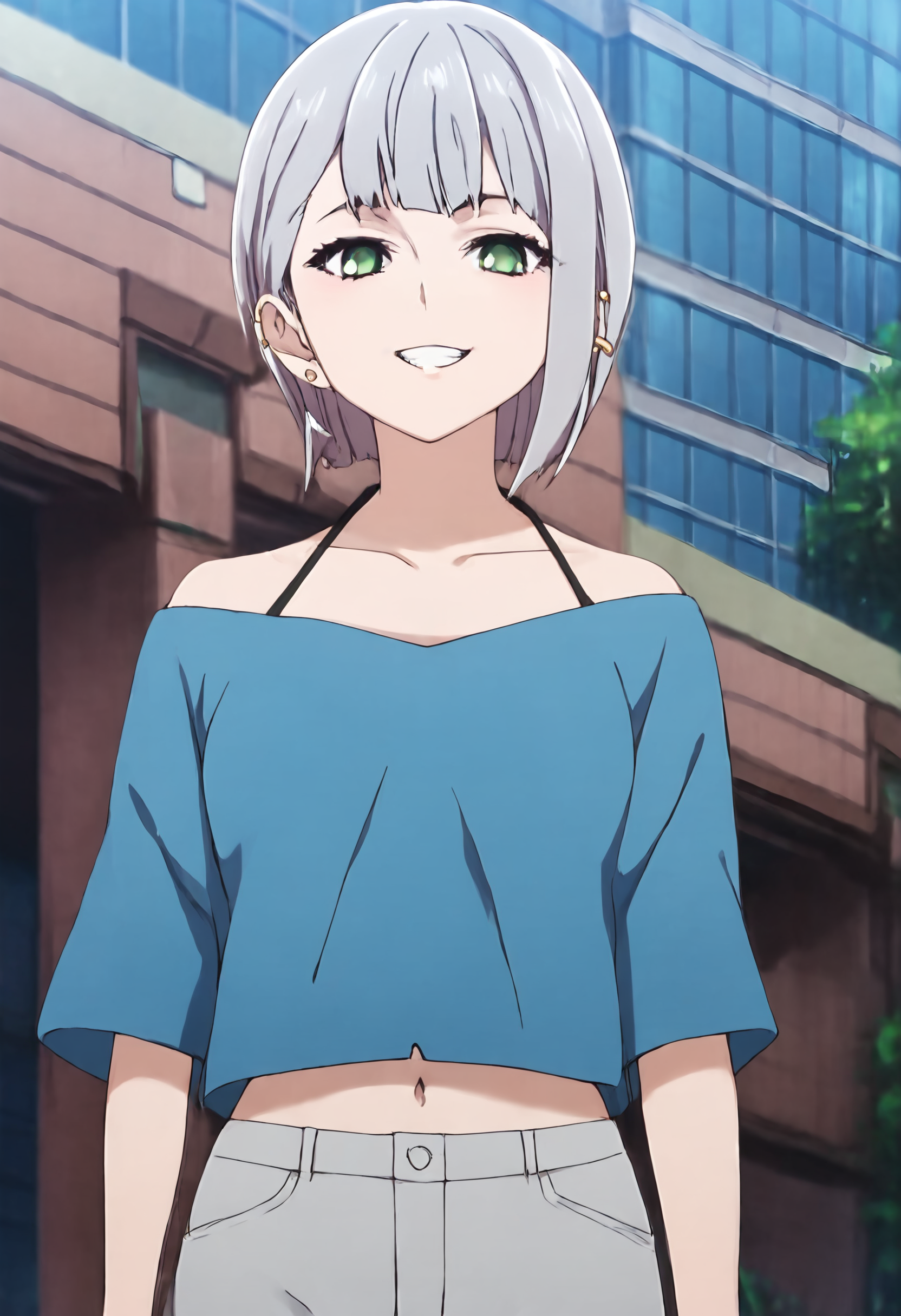 blue shirt, off-shoulder shirt, ear piercing, grey pants