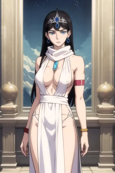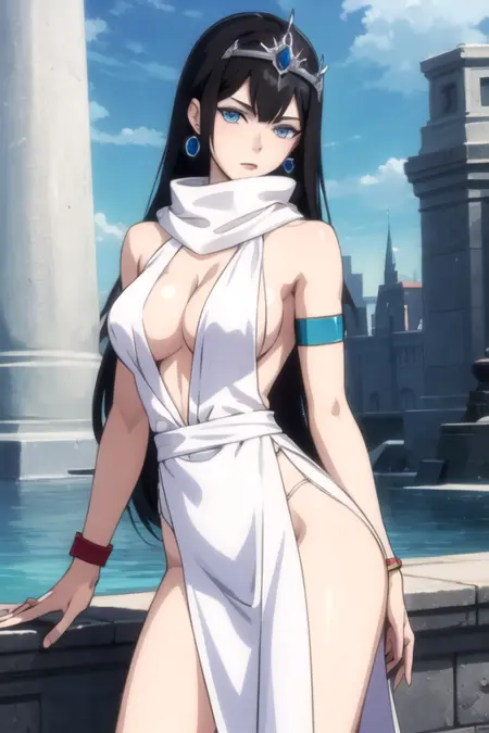 AilaSKL, 1girl, solo, long hair, blue eyes, large breasts, black hair, white dress, cleavage, bare shoulders, jewelry, earrings, scarf, sideboob, tiara, armband, pelvic curtain