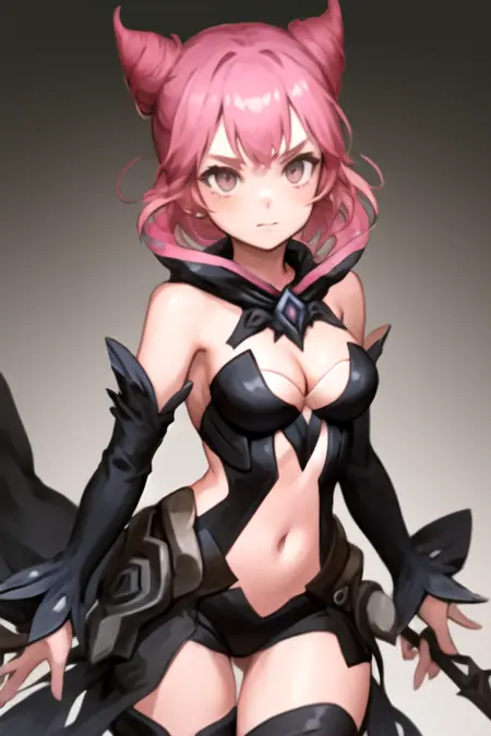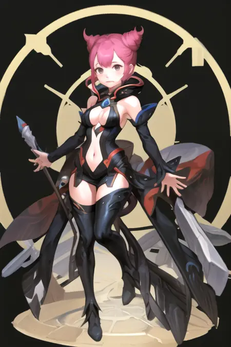SorceressDN, 1girl, solo, short hair, thighhighs, black dress, navel, cleavage, bare shoulders, medium breasts, pink hair, detached sleeves, hair buns