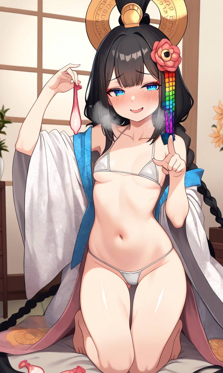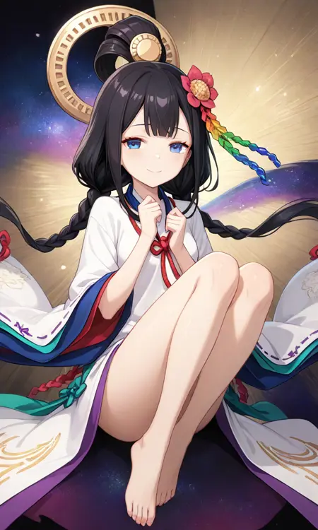 Menreiki, blue eyes, long hair, black hair, wide sleeves, barefoot, japanese clothes, twin braid, flower, white outfit, barefoot, bare legs, hair ornament