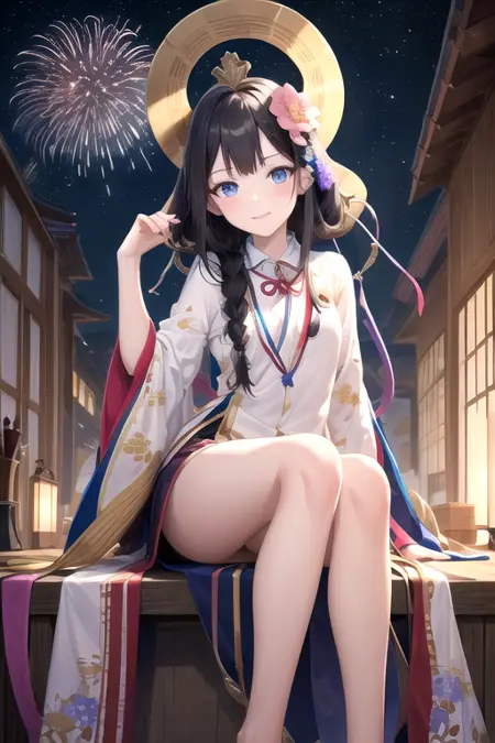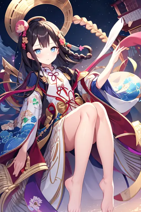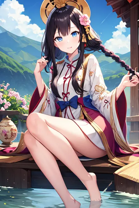 1 girl, blue eyes, long hair, black hair, wide sleeves, barefoot, japanese clothes, twin braid, flower, white kimono, barefoot, hair ornament