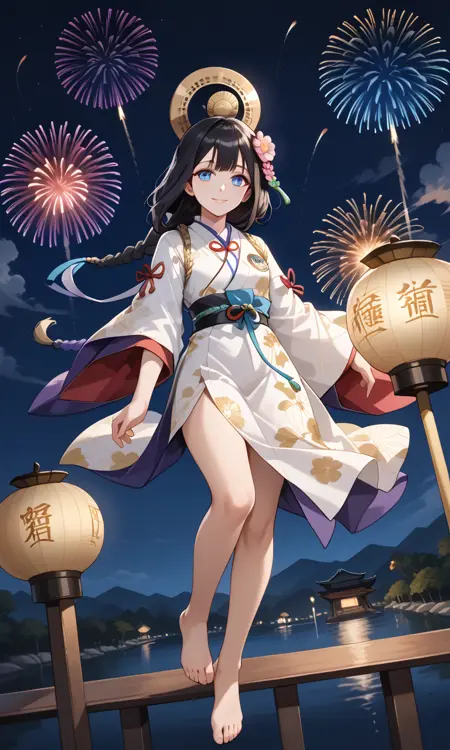 Menreiki, blue eyes, long hair, black hair, wide sleeves, barefoot, japanese clothes, twin braid, flower, white outfit, barefoot, bare legs, hair ornament
