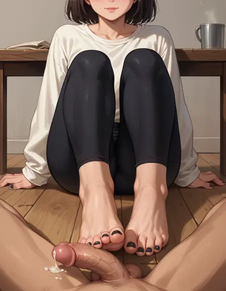关键词: 1girl,描述鞋履、颜色 指甲油,1boy,hud_c0ckst3pping,出画,阴茎,勃起/疲软,睾丸,木桌,被踩,聚焦脚部,Femdom,足交,精液