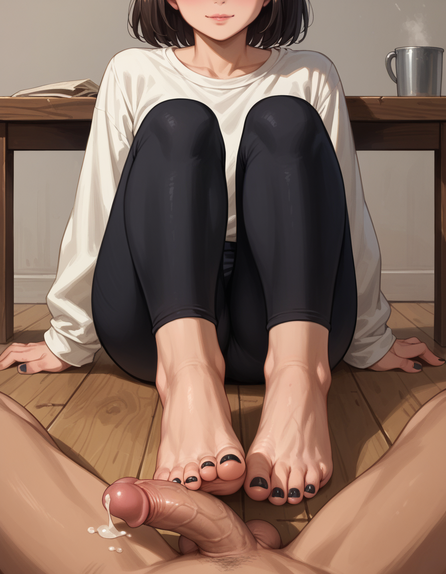 키워드: 1girl, 발신발 설명, 색상, 발톱 매니큐어, 1boy, hud_c0ckst3pping, 프레임 밖, 음경, 성기 발기/비발기, 고환, 나무 탁자, 밟힘, 발 중심, femdom, footjob, 정액