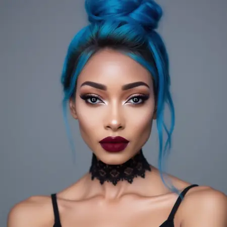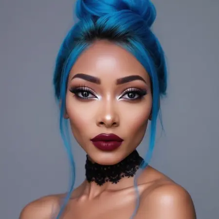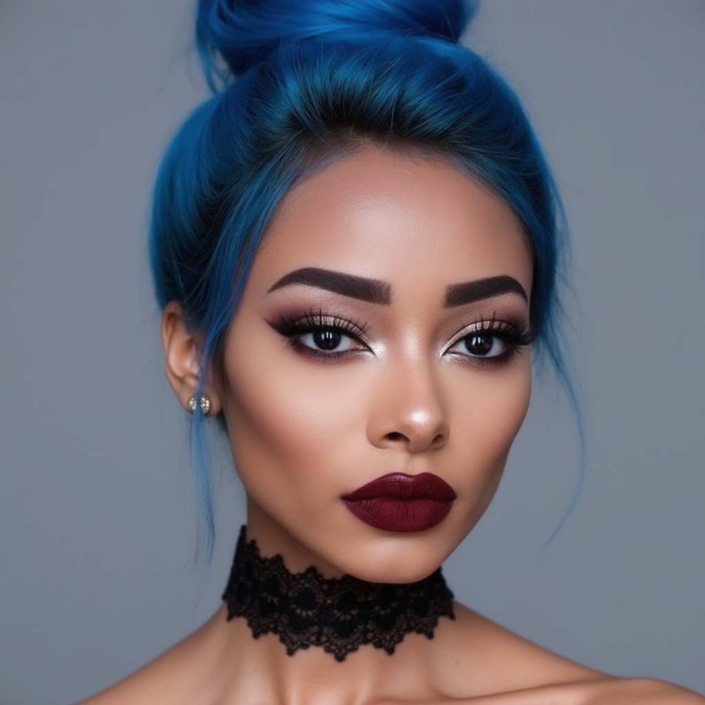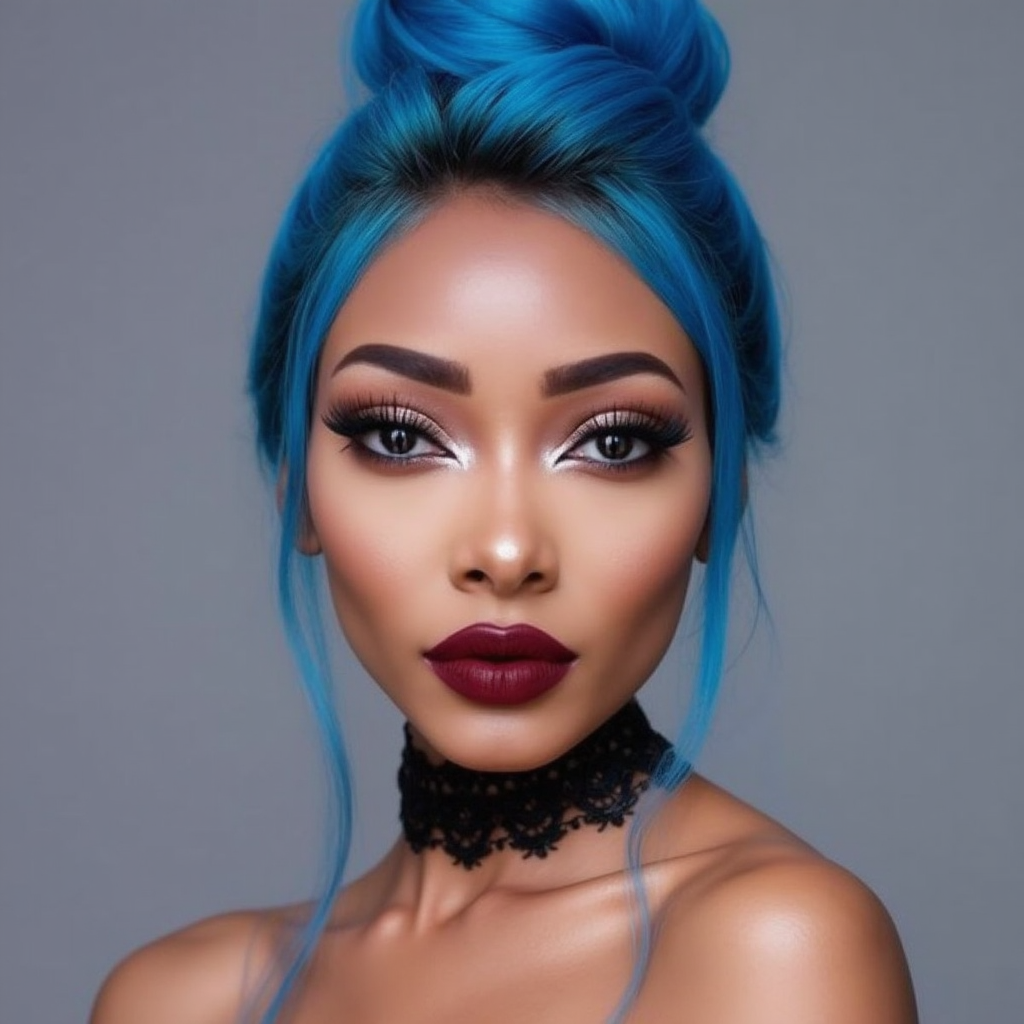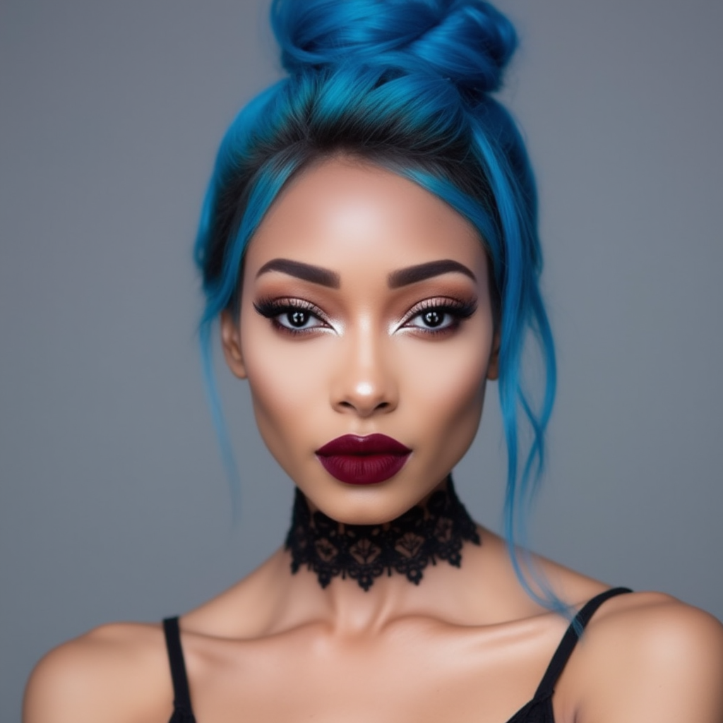 画像には、際立った外見の黒人女性が描かれています。彼女は鮮やかな青い髪を高い结い上げており、顔を囲むようにいくつかのほつれた髪が落ちています。メイクは大胆で洗練されており、整った濃い眉、ドラマチックな長いまつげ、目を引き立てるきらびやかなアイシャドウが特徴です。彼女は深みのある赤いリップをつけており、洗練され、ゴージャスな印象をさらに強調しています。また、彼女は繊細な黒いレースのチョーカーを着けており、全体のスタイルを補っています。背景は無地の控えめなグレーで、彼女の際立った特徴に注目が集まるようにしています。