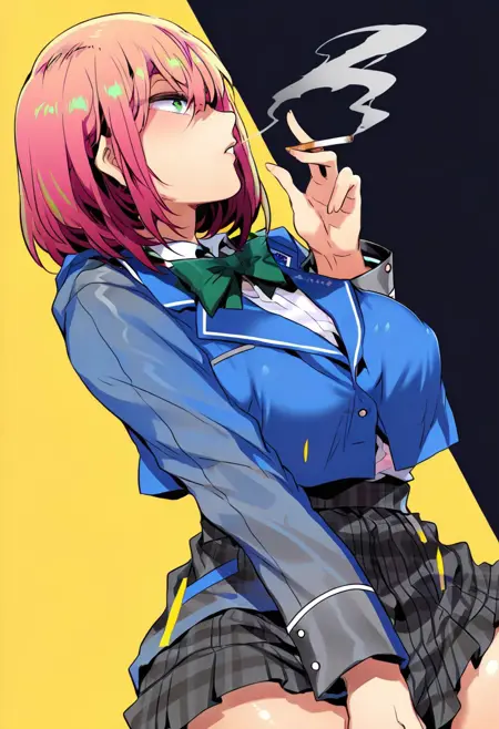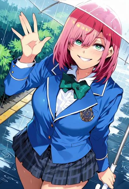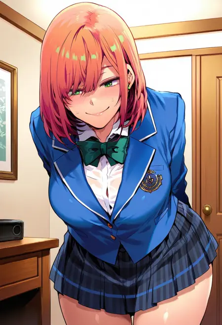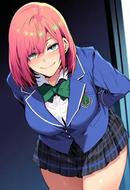 1. ((フォーマルで美しい青い制服、長袖の青いスーツジャケット、緑色のボウタイ、長袖の白いシャツ、濃い青のチェック柄のプリーツスカート))