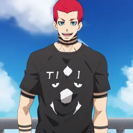 black shirt, male focus, t-shirt, red hair, Neck tattoos, blue eyes, arm tattoo