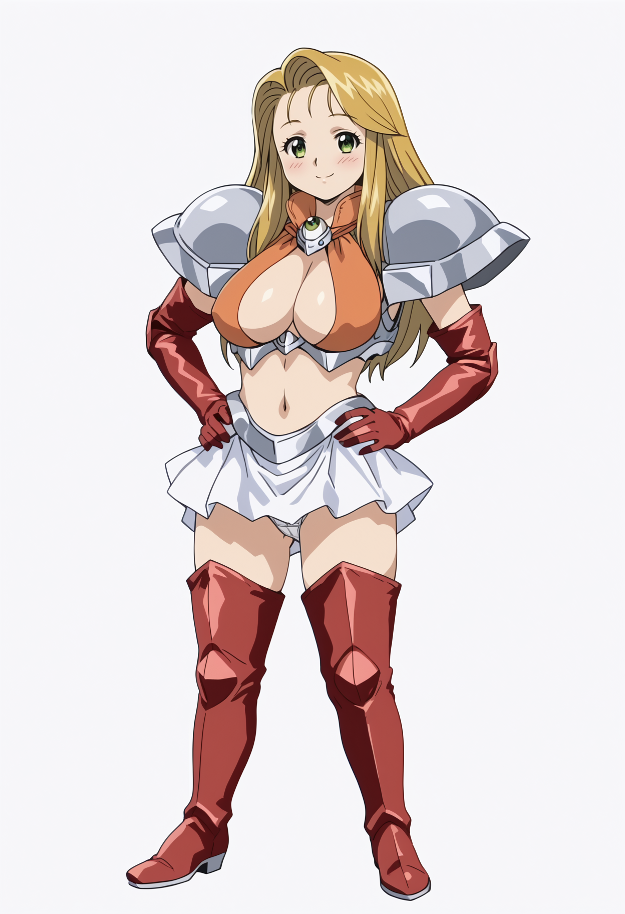Hunter outfit prompts : armor, cleavage, center opening, shoulder pads, hunterarmor, red gloves, white skirt, thigh boots, thighhighs, underwear, white panties