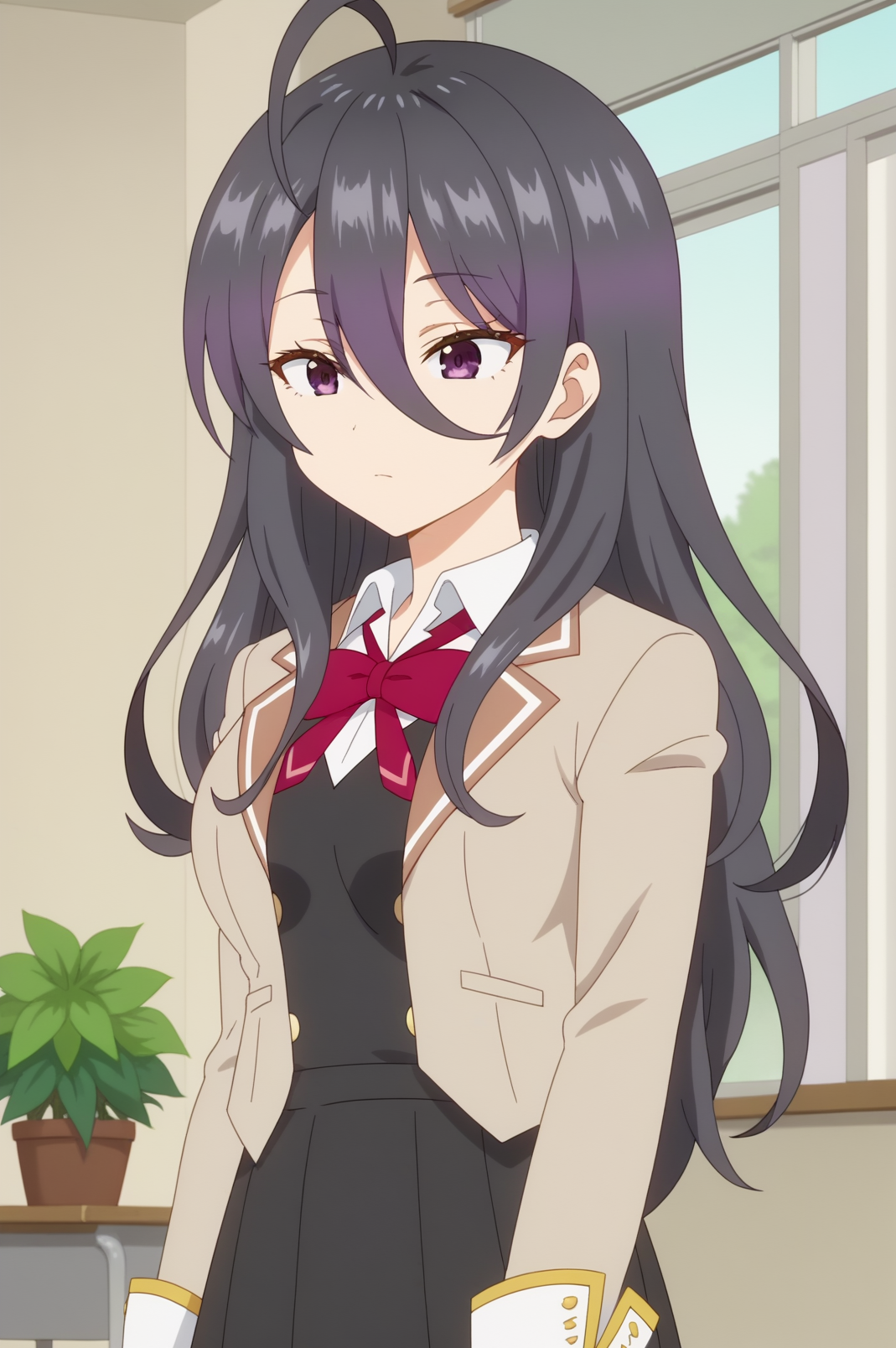 트리거: 긴 머리, 셔츠, 학교 유니폼, 재킷, 혼자, 리본, 아호게, 눈 사이의 머리카락