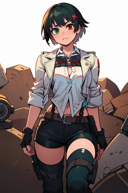 外观标签: 短发、黑发、刘海、异色瞳、红眼、绿眼、护目镜、护目镜挂在脖子上、白衬衫、白色夹克、长袖、袖子卷起、手套、露指手套、黑色短裤、腰带、枪套、过膝袜、大腿枪套