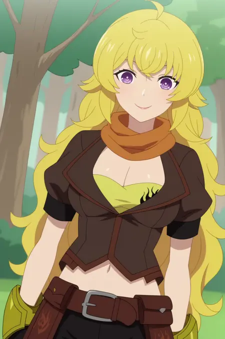 yang xiao long,fingerless gloves,gloves,long hair,ahoge,smile,breasts,forest,tree,navel,cleavage,scarf