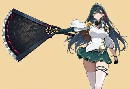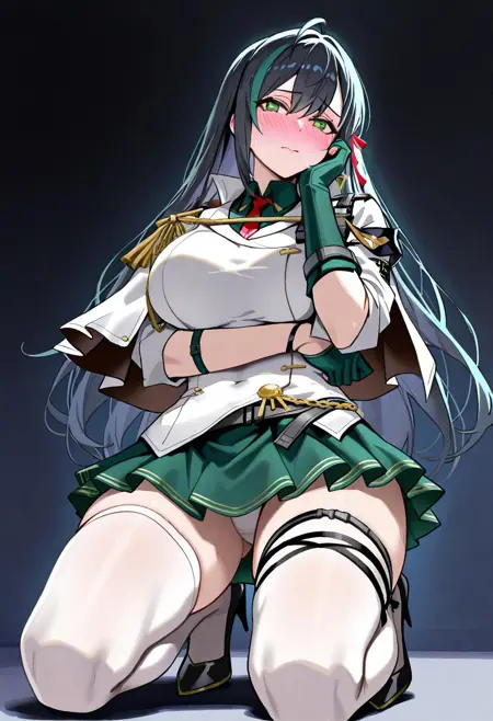 衣装: ピアス、赤いネクタイ、赤いヘアリボン、グリーンのアンダーシャツ、白い軍服ジャケット、カペレット、ゴールドの肩章、非対称なグリーンの手袋、ベルト、ストラップ、ゴールド縁取りのグリーンスカート、グリーンスカート、ミニスカート、白い thighhighs、黒いハイヒール