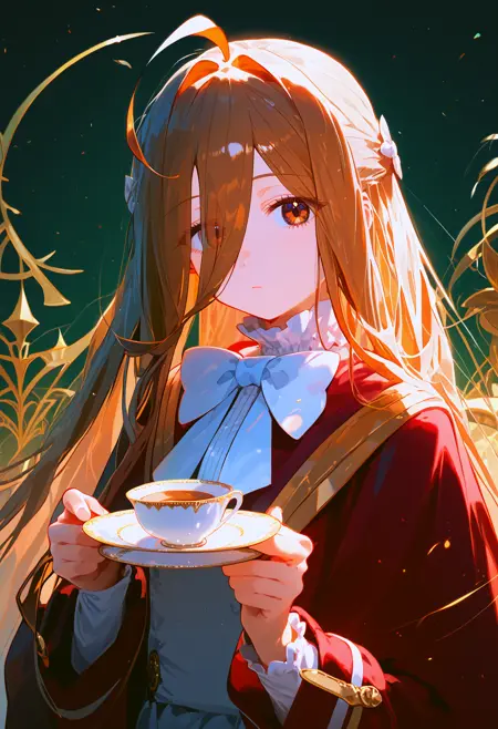 sense \(sousou no frieren\), long hair, cup, ahoge, brown hair, teacup, bow, hair over one eye, closed mouth, hair between eyes, very long hair, eyes visible through hair, saucer, bowtie