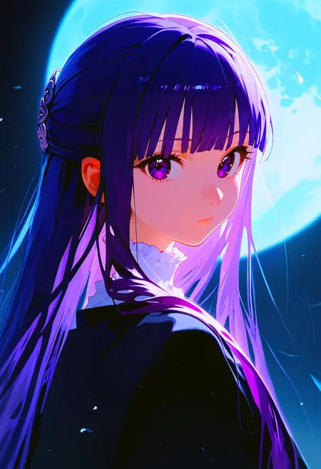 fern \(sousou no frieren\), bangs, closed mouth, very long hair, sidelocks, purple eyes, purple hair, full moon, backlighting