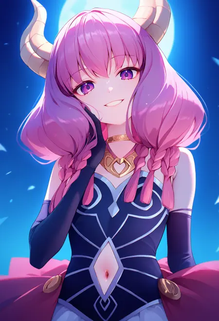 aura \(sousou no frieren\), elbow gloves, clothing cutout, black gloves, demon girl, braid, navel cutout, demon horns, purple eyes, long hair, multiple braids, gold necklace, dress, jewelry, bare shoulders, pink hair, purple hair, low-braided long hair, necklace, night, low-tied long hair, evil smile