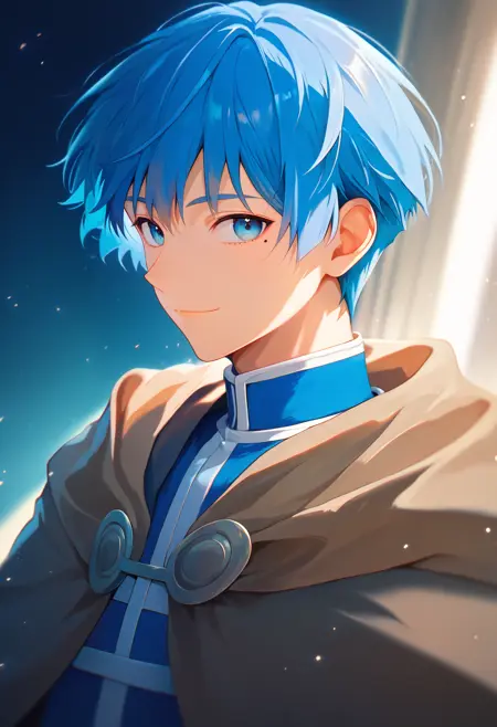 himmel \(sousou no frieren\), mole under eye, mole, smile, short hair, cloak, blue hair, blue eyes, profile, closed mouth, cape
