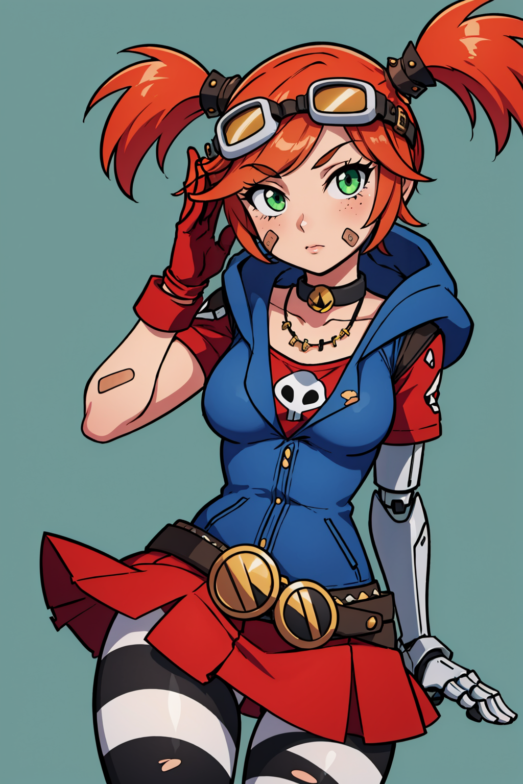 아웃핏 태그: 머리 위 안경, 얼굴 상처, 펜던트 목걸이, 장갑, 벨트, 스커트, 줄무늬양말, 후드, 목걸이, 찢긴 옷