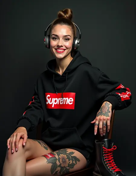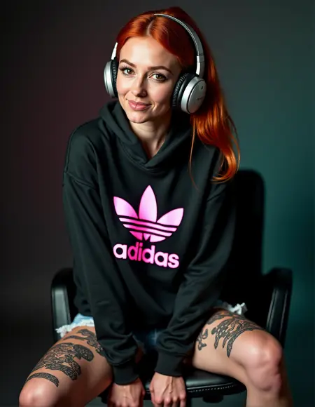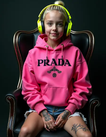 "outfit" 프롬프트에 포함된 항목: 스웨터, 부츠, 퓨처리스 헤드폰, 데님 반바지, 유명한 국제 브랜드.