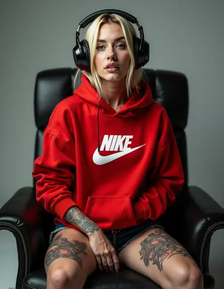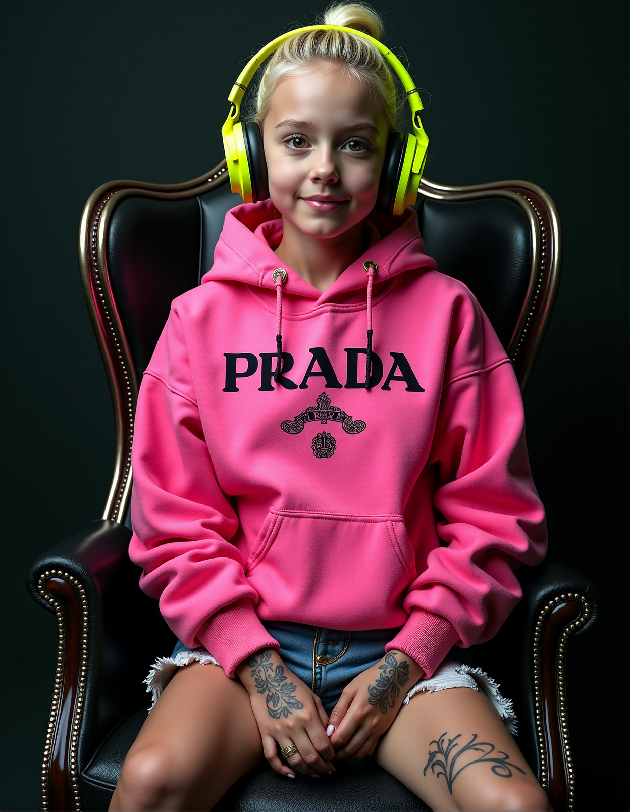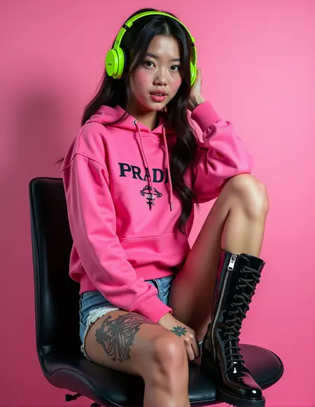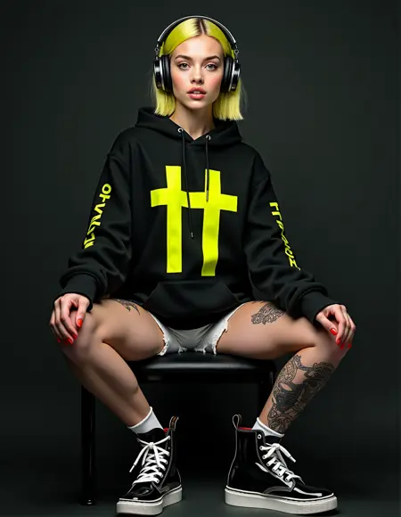 Promt “outfit” includes: Sweatshirt, boots, futuristic headphones, denim shorts, famous international brands.