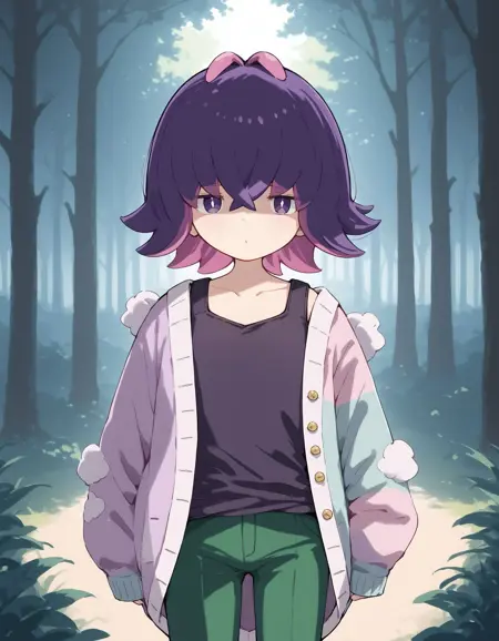 freckles, green pants, lilac sweater, purple tank top, purple eyes, hidden eyes, short hair, pink hair, purple hair, white pupils, Dot