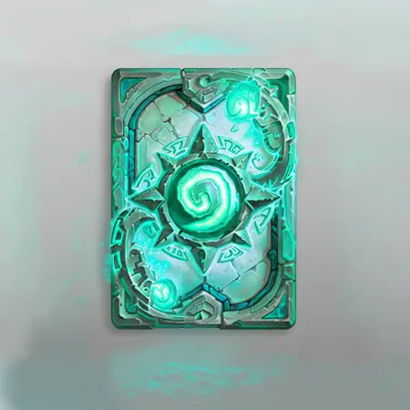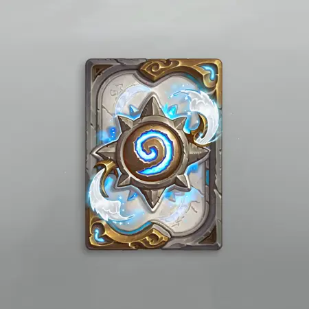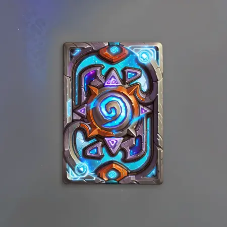 例:闇の戦士の盾を反映したカードの裏面。中央には紫光るハースストーンのロゴ。濃いグレーの背景。
