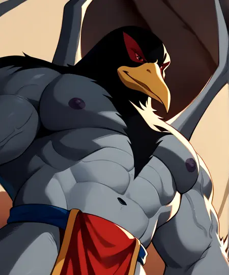 このモデルのプロンプトは、「Raven the Trickster」「raven」「gargoyle」「muscular」「red eyes」「red marking around eyes」「grey skin」「black feathered head」「black feathered shoulders」「black feathered chest」「black feathered upper body」です。元々は短いプロンプトでしたが、目の周りの赤い模様や黒い羽の部分を明記しなかった最初の数回の試行では、半分以上でこれらの特徴が欠落していました。