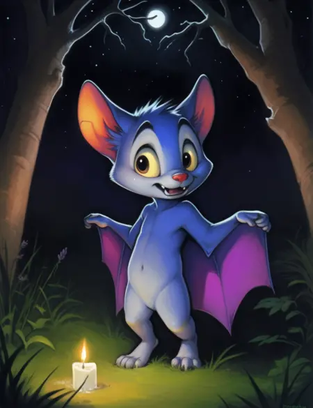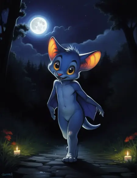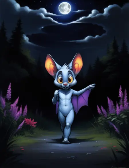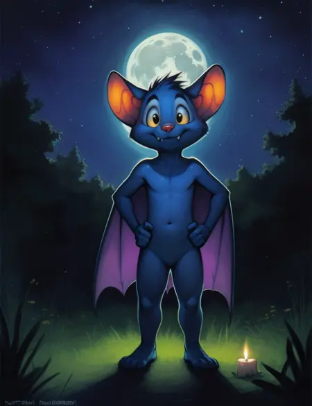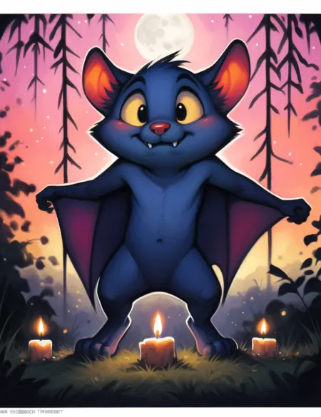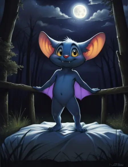FlyingBatBrother, bat, blue fur, red nose, (chibi), vampire, fangs, yellow sclera,