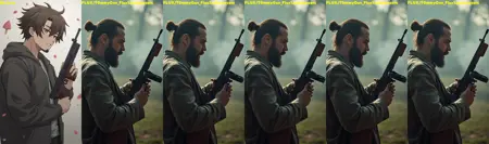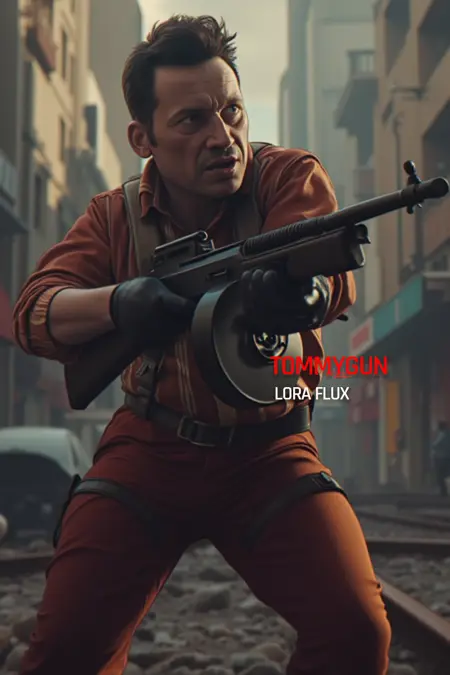 This Flux/XL LoRA wields a tommy gun, heart-shaped eyewear perched on the nose, ammo belts, hazy smoke swirls around the figure, blending the tough and the playful into a surreal, captivating scene.