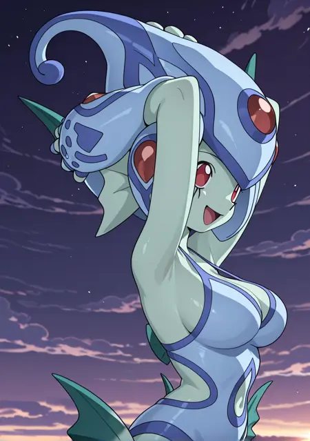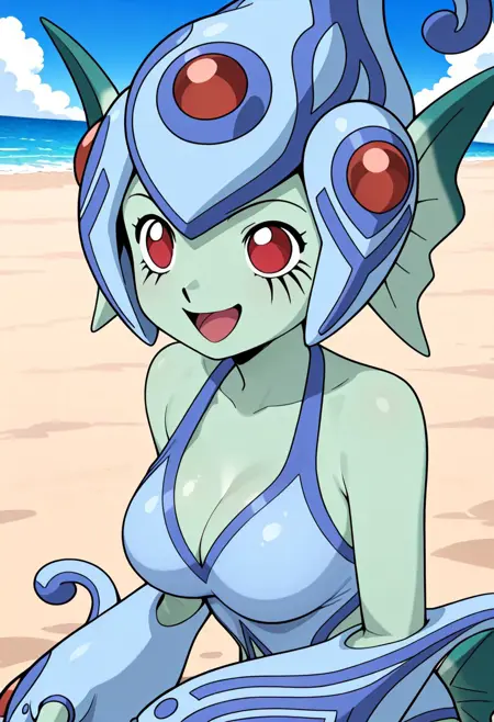Prompt:digimon, digimon frontier, ranamon, 1girl, solo, green skin, red eyes, monster girl, breasts, colored skin, open mouth, gloves, fingerless gloves, helmet, cleavage, sky, medium breasts, blue skin, head fins