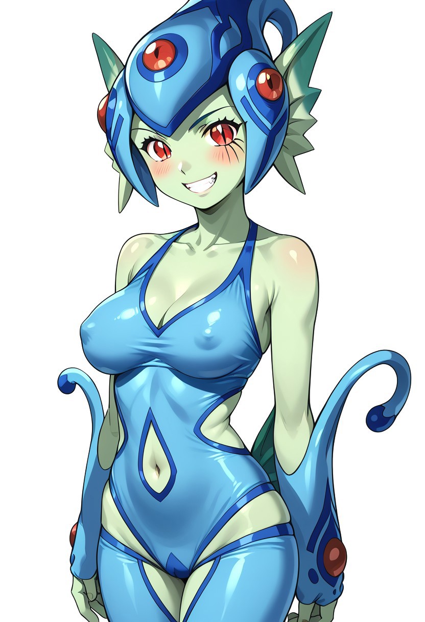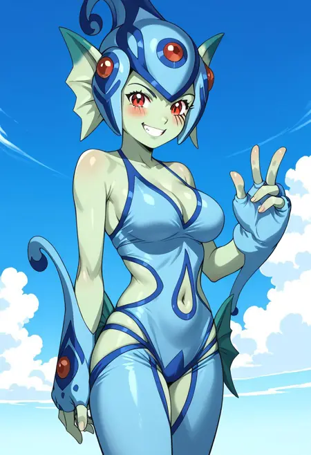 Prompt:digimon, digimon frontier, ranamon, 1girl, solo, green skin, red eyes, monster girl, breasts, colored skin, open mouth, gloves, fingerless gloves, helmet, cleavage, sky, medium breasts, blue skin, head fins
