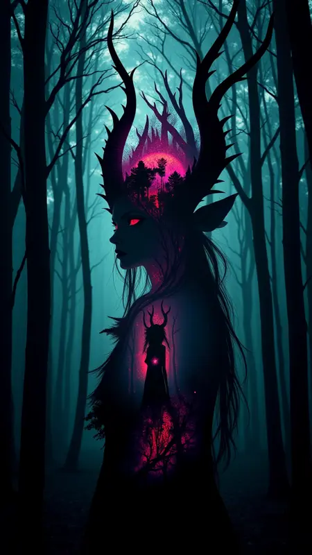 - 숲이 결합된 이중 노출 미학: 악마의 실루엣과 숲 요소를 매끄럽게 결합하여, 숲속 환경의 기묘한 아름다움을 일으키는 층층이 이루어진 끔찍한 시각 효과를 창출합니다.