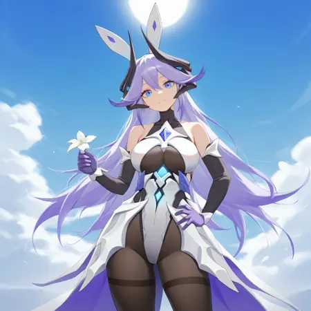 Bel_EL、紫の髪、黒い角、ウサギの耳、ボディーストッキング、白いレオタード、鎧付きレオタード、太ももバンドタイツ、胸元カバー、鎖骨カバー、胸の宝石、白い鎧、ボディスーツのアンダーブーブ、ツートーンスカート、紫のスカート、白いスカート、裸の肩、ジュエリー、宝石、取り外し可能な袖、黒い袖、紫の手袋、白いブレスレット、