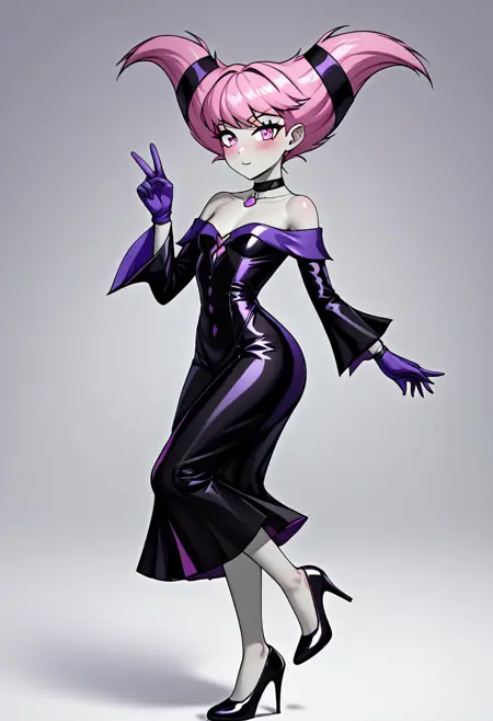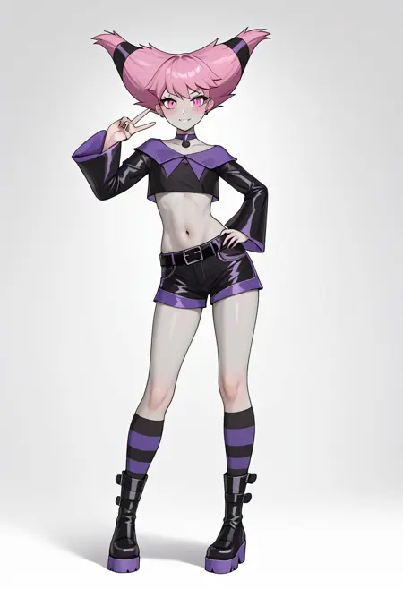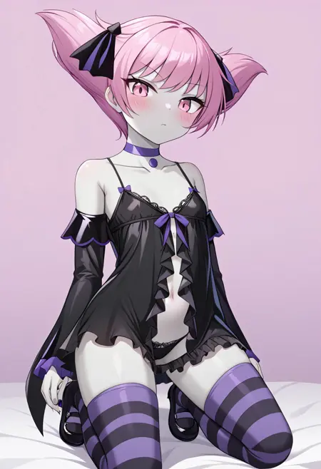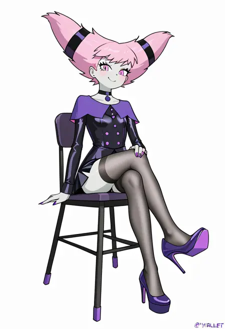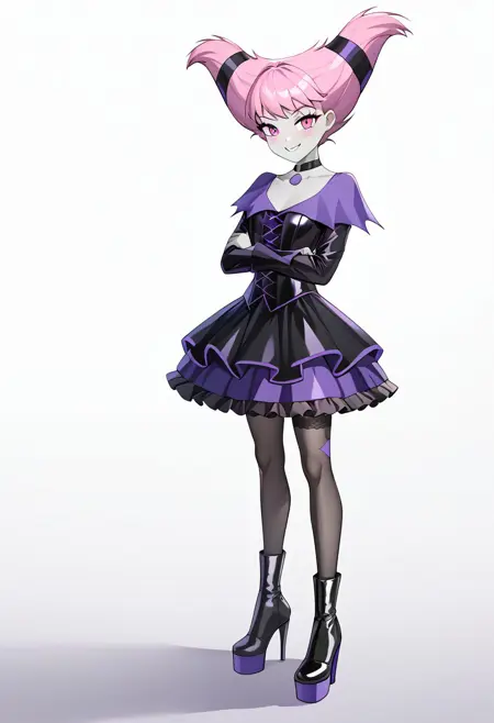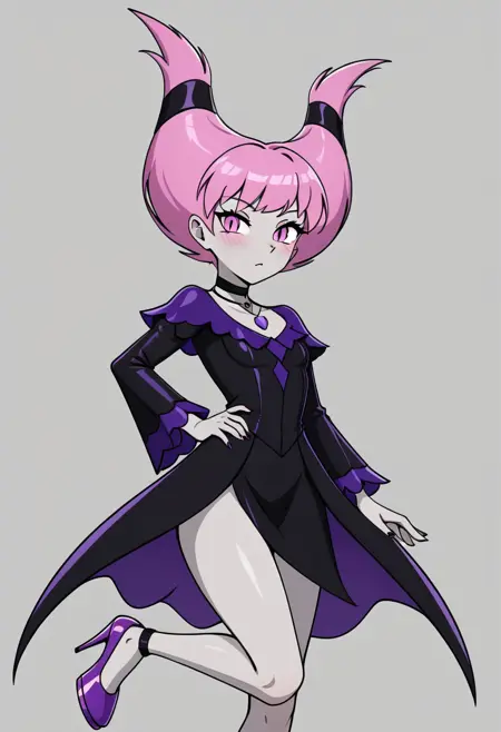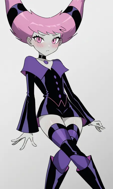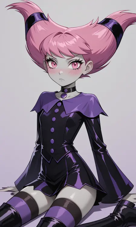 Petite, small bust, short pink hair, pale grey skin, pink eyes, blush, short black dress, violet pointed lapel, violet buttons and details, long flared sleeves, thigh-high stockings with violet and black stripes, black boots, black choker, violet medallion