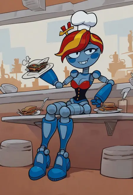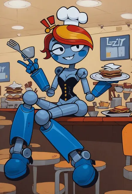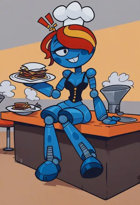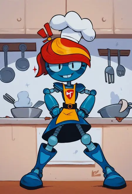 Made from just two near-identical images, so don't get too fancy with it. Tags are "Ladytron, android, robot joints, apron, boots, chef hat, multicolored hair, red hair, belt".
