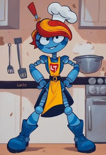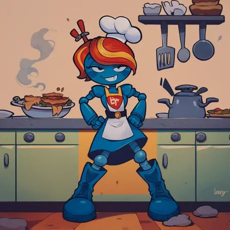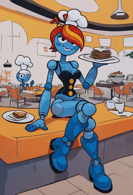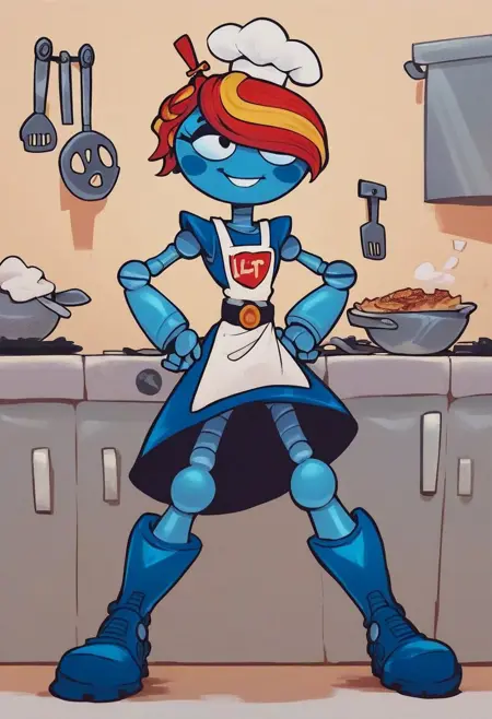 ほぼ同じ2つの画像だけで作られているので、あまり複雑にしないでください。タグは「Ladytron、アンドロイド、ロボット関節、エプロン、ブーツ、シェフ帽、多色の髪、赤髪、ベルト」です。