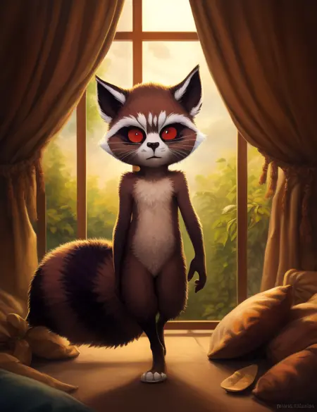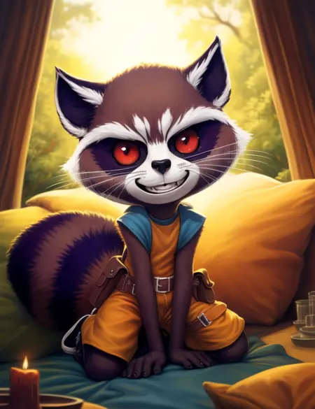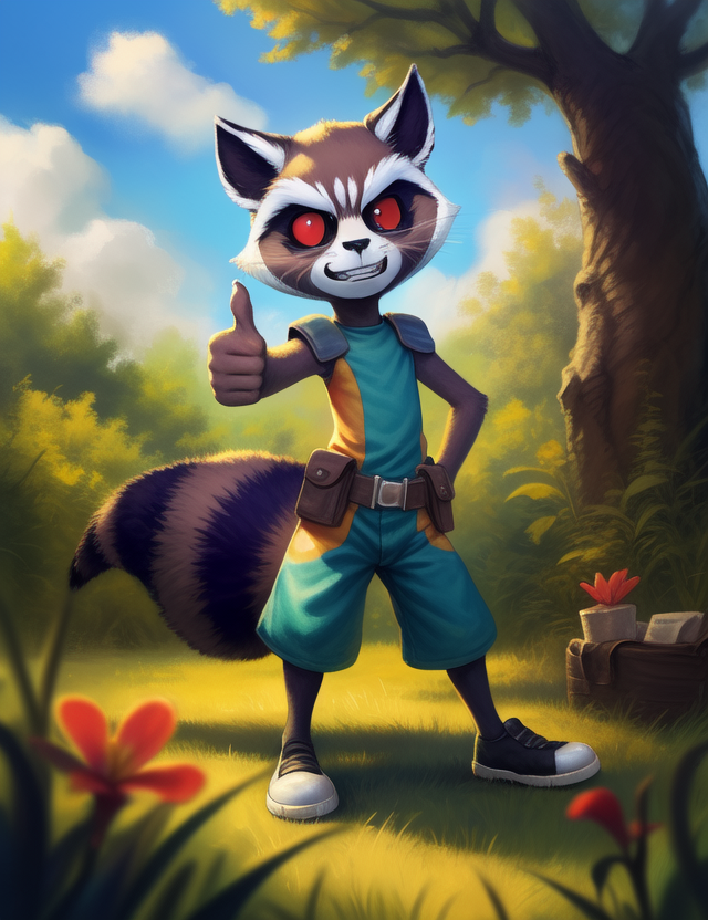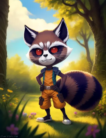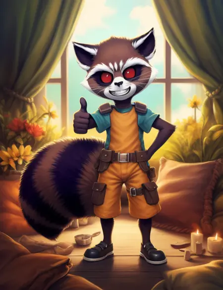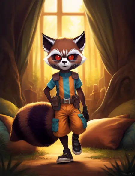 <lora:RocketGrVerYif:1> RocketGrVer, Raccoon, red eyes, tail, orange jumpsuit, shoes,