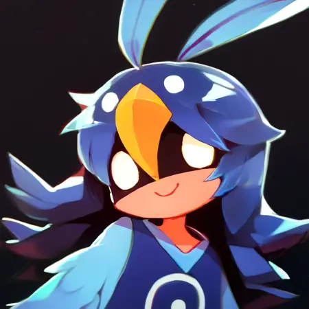 AlulaOneShot, female, solo, harpy humanoid, long hair, blue feather in hair, multi eye, yellow beak on forehead, blue feathers, blue sleeveless dress, blue symbol print, black humanoid hands, blue feathered thighs, anisodactyl, short