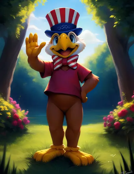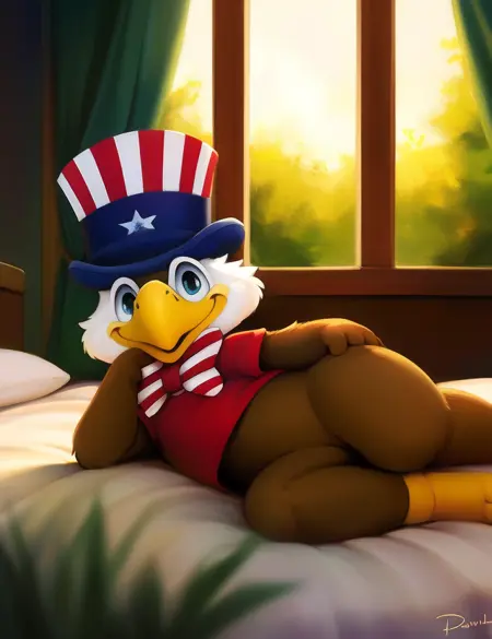 EagleANSamMas, Eagle, bow tie, red t-shirt, top hat, red white blue hat, Chibi, (bare bottom,)