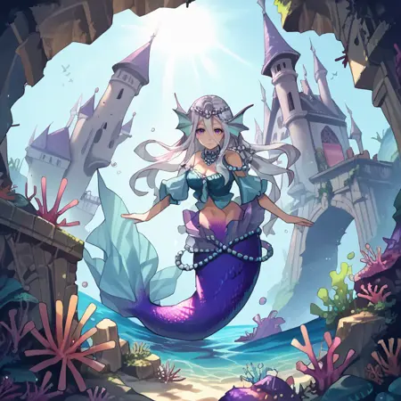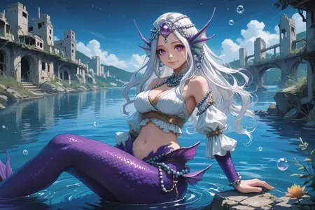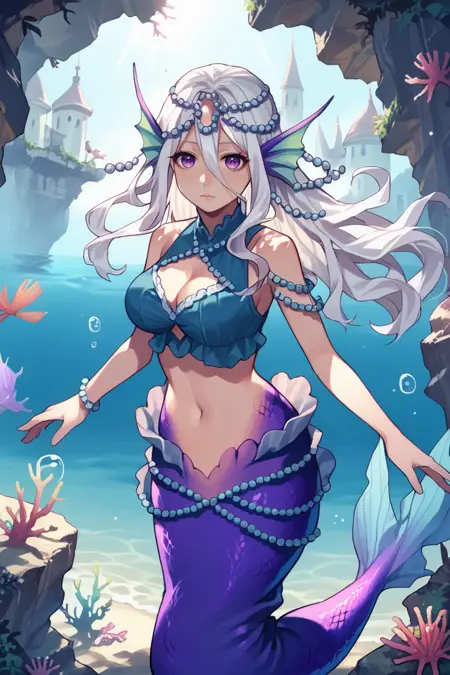 役立つタグ: 1girl, (mermaid), mermaid tail, monster girl, purple eyes, long hair, hair between eyes, white hair, head fins, purple scales, cleavage, navel, midriff, sleeveless, blue top, yellow chest wrap, jewelry, beads, pearl (gemstone)