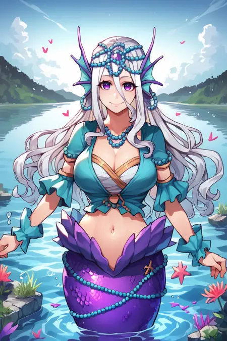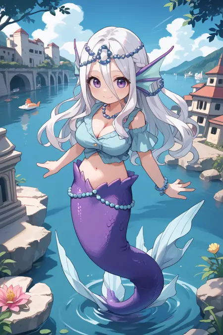 役立つタグ: emdef, 1girl, (mermaid), monster girl, purple eyes, long hair, hair between eyes, white hair, head fins, purple scales, cleavage, navel, midriff, sleeveless, (blue top), blue vest, yellow chest wrap, jewelry, beads, pearl (gemstone)