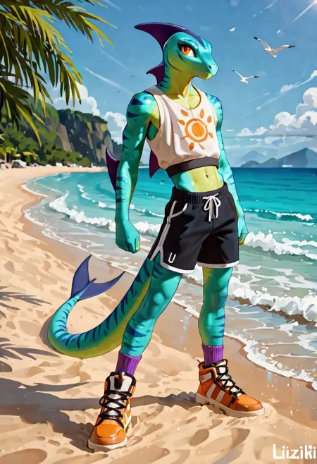 推奨タグ:青と緑の肌、オレンジの目、紫の背びれ