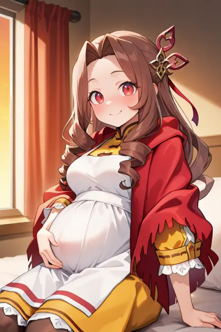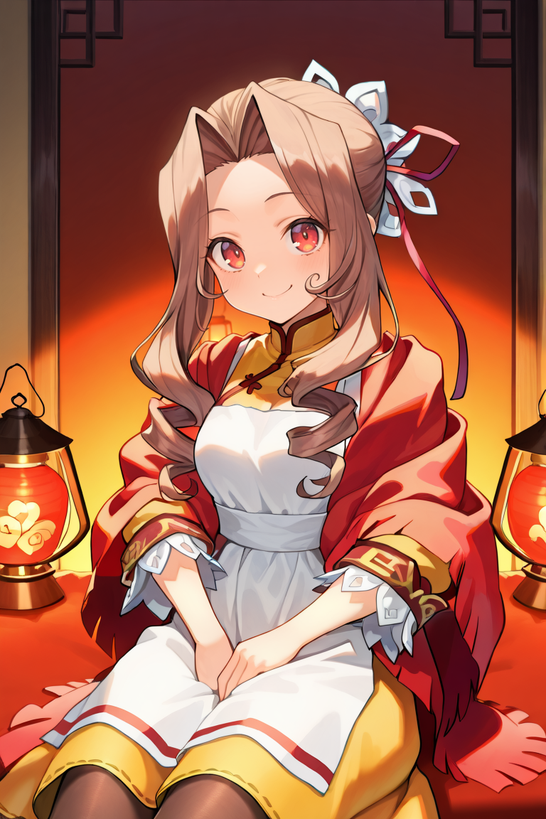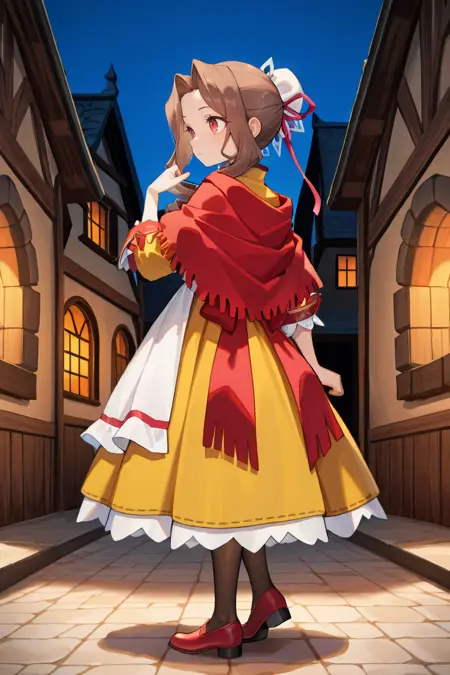常用标签: 1girl, 长发, 棕发, 红眼, 发髻, 发带, 带子, 连衣裙, 黄色裙子, 褶边袖口, 红色披肩, 白色围裙, 围裙, 黑色连裤袜, 红色鞋子,