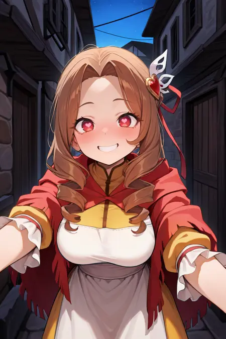 常用标签: 1girl, 长发, 长鬓发, 钻石状鬓发, 棕发, 红眼, 发髻罩, 发饰, 单发髻, 发带, 带子, 连衣裙, 黄色上衣, 袖子过肘, 褶边袖子, 黄色裙子, 红色披肩, 白色围裙, 围裙, 围裙罩在黄色上衣外, 连裤袜, 红色鞋子