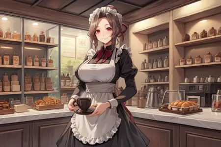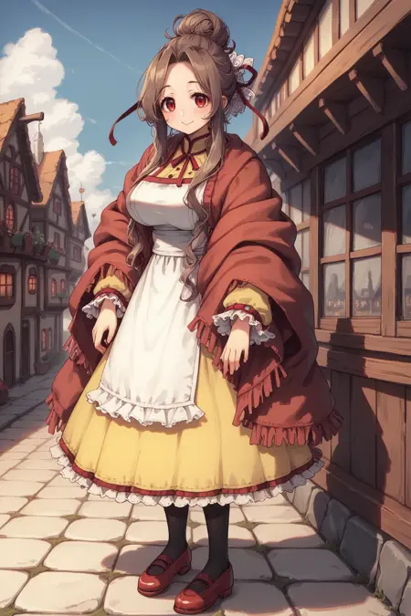 常用标签: 1girl, 长发, 棕发, 红眼, 发髻, 发带, 带子, 连衣裙, 黄色裙子, 褶边袖口, 红色披肩, 白色围裙, 围裙, 黑色连裤袜, 红色鞋子,