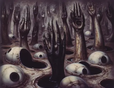 gigerart. A piece of art by HR Giger. The artwork depicts a complex and intertwined composition of skeletal, humanoid figures and serpentine forms. The central figure is arched, with visible ribs and elongated limbs. Surrounding this figure are other creatures, similarly skeletal, with elongated skulls and limbs that intertwine with each other. The scene is rendered in monochrome tones, blending organic and mechanical elements in a fluid, continuous motion. The artwork is noisy and messy with scratches and canvas marks in places and desaturated colours.