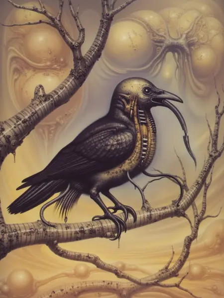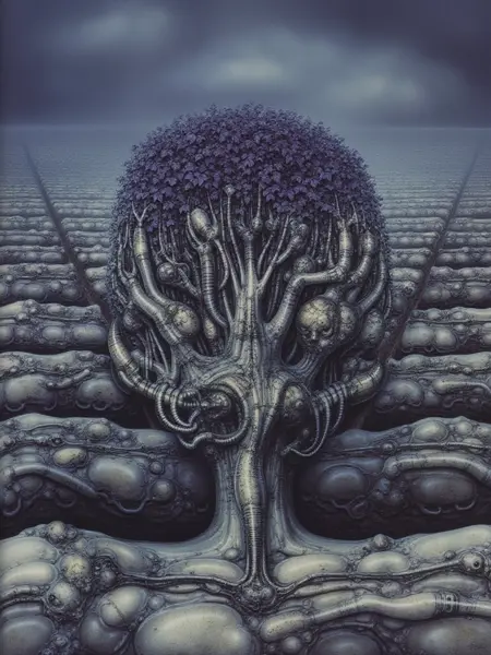 gigerart. H.R. 기거의 작품. 이 작품은 골격과 인체 형태, 뱀 같은 형체들이 복잡하게 얽힌 구성으로 이루어져 있다. 중심 인물은 휘어져 있고, 갈비뼈와 길게 늘어난 사지가 드러나 있다. 이 중심 인물을 둘러싼 다른 생물들도 유사한 골격 구조를 지니고 있으며, 길게 늘어난 두개골과 사지가 서로 얽혀 있다. 장면은 단색 톤으로 표현되어 유기적이고 기계적인 요소들이 유동적이고 지속적인 움직임으로 혼합되어 있다. 작품은 잡음과 흠집, 캔버스의 흔적이 곳곳에 보이며, 색상은 색채가 희미하게 처리되어 있다.