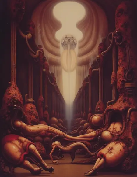 gigerart. A piece of art by HR Giger. The artwork depicts a complex and intertwined composition of skeletal, humanoid figures and serpentine forms. The central figure is arched, with visible ribs and elongated limbs. Surrounding this figure are other creatures, similarly skeletal, with elongated skulls and limbs that intertwine with each other. The scene is rendered in monochrome tones, blending organic and mechanical elements in a fluid, continuous motion. The artwork is noisy and messy with scratches and canvas marks in places and desaturated colours.