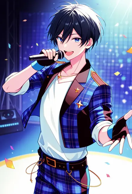 hokuthida, 1boy, male focus, solo, blue eyes, black hair, short hair, bangs, hair between eyes, trickstar uniform, jewerly, necklace, shirt, white shirt, collarbone, jacket, blue jacket, plaid jacket, open jacket, open clothes, sleeves rolled up, single glove, black gloves, fingerless gloves, wristband, belt, star (symbol), pants, blue pants, plaid pants, plaid, shoes, sneakers, blue footwear,